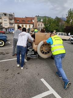 Il arrive que la voiture tombe en panne, heureusement il y a plein de monde pour pousser ! Et après, elle repart !